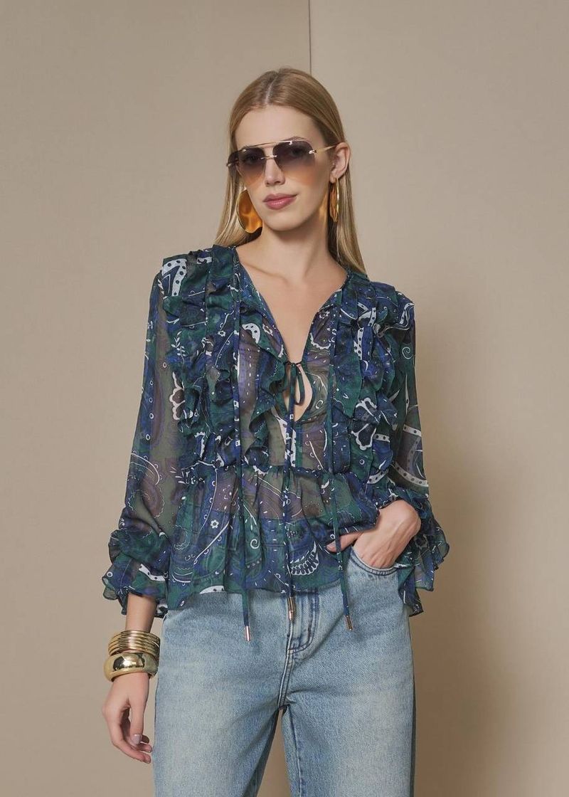 RoupasNew InAKROBlusasCamisasBata Feminina Estampada Com Babados - Verde