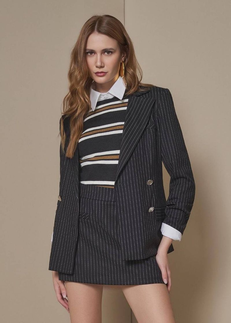 O blazer listrado Preto é sinônimo de impacto e elegância. As listras se destacam de forma sofisticada, dando profundidade ao visual sem pesar. Os recortes frontais e posteriores esculpem a silhueta, e os detalhes em metal reforçam o estilo refinado da peça. Combinando modernidade e atemporalidade, é o blazer perfeito para elevar qualquer produção com um toque de força e personalidade.