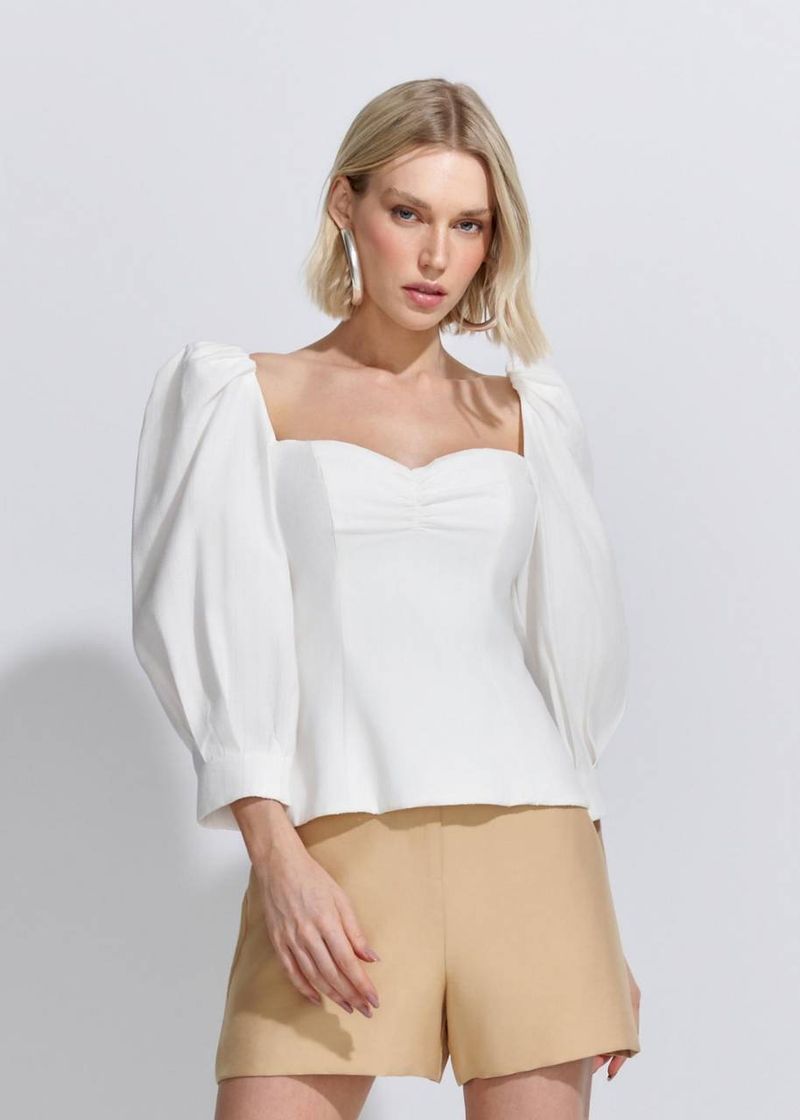 Em off white, a peça aposta na elegância clean com seu decote coração e shape ajustado. As mangas longas bufantes equilibram a sensualidade do busto marcado com o romantismo da textura visco. Uma escolha versátil para ocasiões especiais ou produções minimalistas sofisticadas. O tom claro realça a leveza da peça, permitindo combinações desde o jeans clássico até saias fluídas ou peças mais estruturadas.
