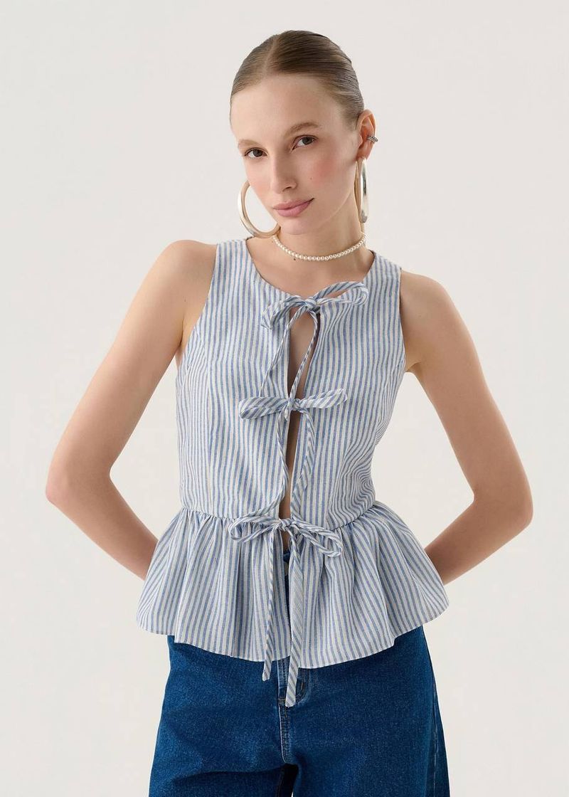No azul, a blusa ganha frescor moderno e vibrante. As listras delicadas destacam o jogo de amarrações frontais, trazendo um charme jovem e despretensioso sem abrir mão da sofisticação. Combine com jeans de cintura alta para um visual casual chic ou aposte em acessórios dourados para elevar a produção. Uma escolha versátil que transita do brunch com amigas a eventos descontraídos ao entardecer.