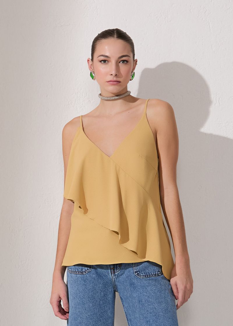 Apresentando um encantador decote em V e alças finas, esta blusa em crepe na suave cor pastel ganha destaque com um delicado detalhe de babado na parte frontal, adicionando um ar de sofisticação e leveza à peça. Para um look fresco e elegante, experimente combiná-la com uma saia midi plissada e sandálias de tiras. Arrase!