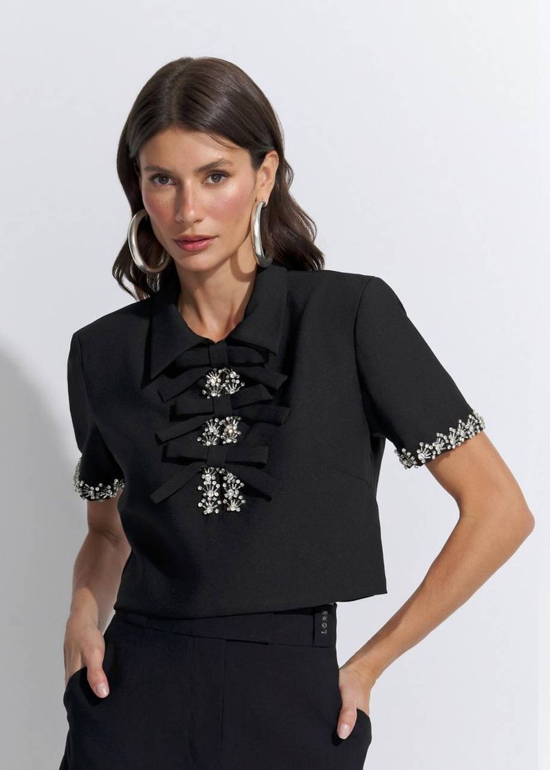 SaleBlusasBlusa Bordado Laços Crepe Munique - Preto