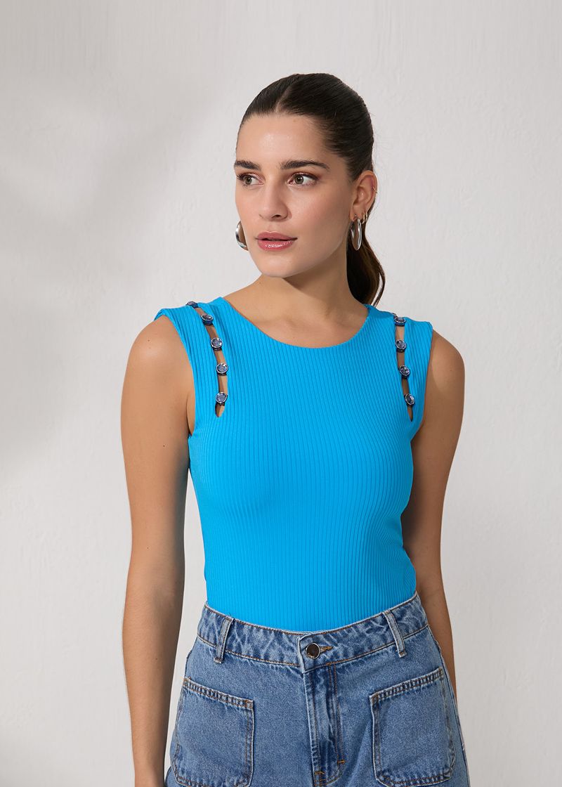 Blusa sem mangas em malha canelada azul com detalhes vazados e aplicações de pedras nas cavas, textura canelada que proporciona caimento moderno e estiloso. Sugestão de look: saia lápis em couro e scarpin, ideal para ocasiões especiais ou eventos. Acessórios coordenados como colar delicado ou brincos discretos são recomendados para completar o visual com sofisticação.