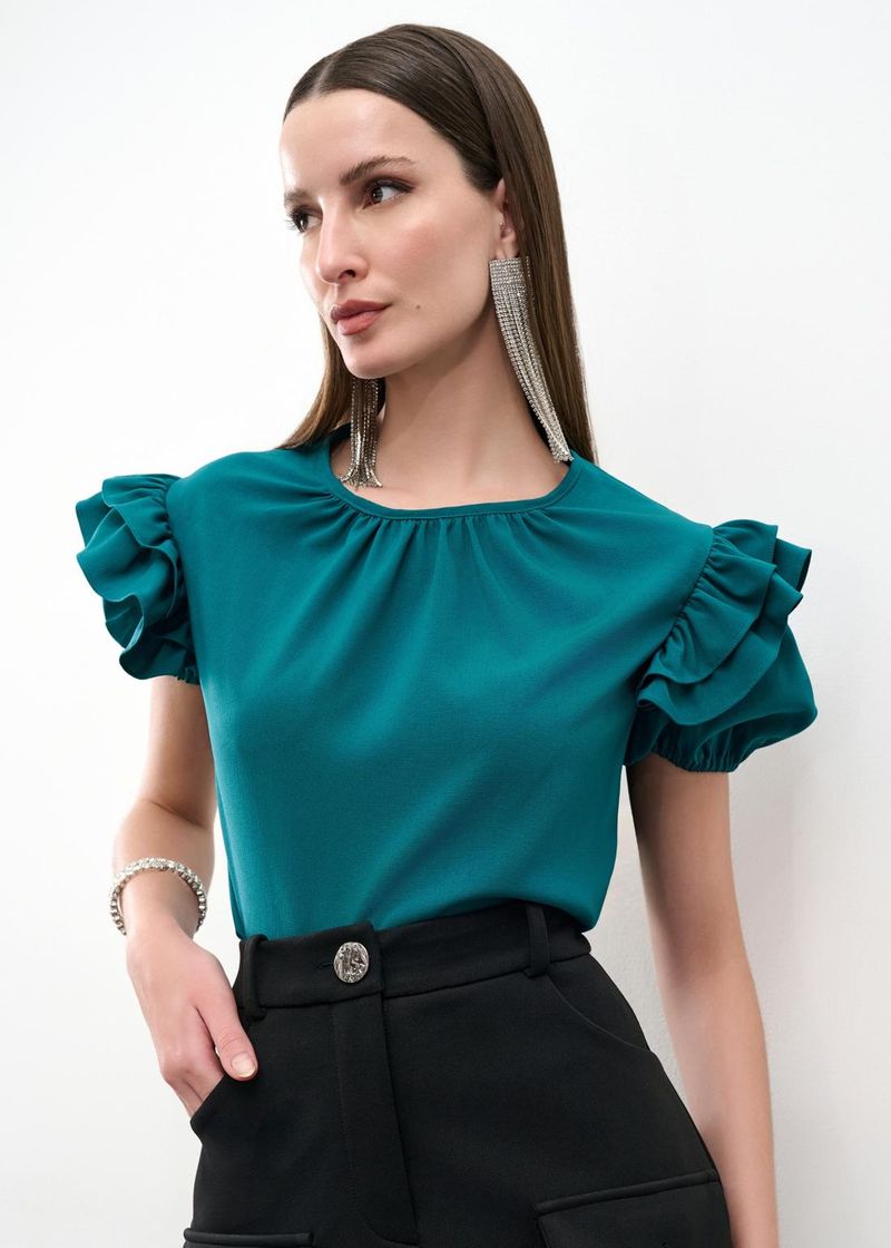 Elegância e delicadeza definem essa blusa em crepe de alfaiataria. O toque especial dos babados nas cavas traz movimento e feminilidade ao design, enquanto a gola com botão forrado nas costas garante um acabamento impecável. No tom esmeralda, a peça se destaca pela sofisticação e frescor. Ideal para encontros formais, combine com saia lápis e sandália de salto para um visual marcante.