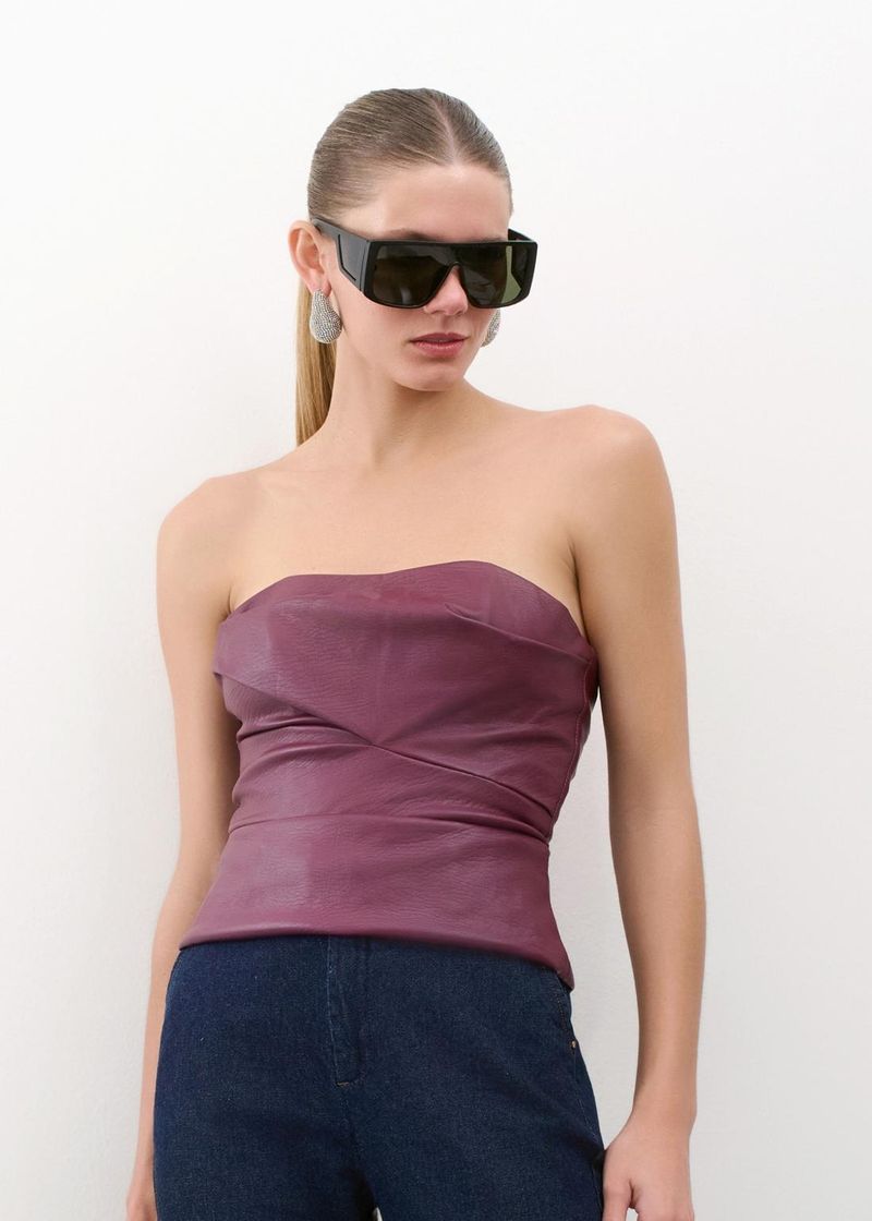 A combinação entre estrutura impecável e acabamento refinado faz dessa blusa sem alças em couro sintético um verdadeiro statement de moda. As dobras frontais bem marcadas criam um efeito esculpido e sofisticado, enquanto o peplum volumoso adiciona um toque feminino e moderno. Os elásticos laterais garantem um ajuste perfeito, proporcionando conforto e modelagem impecável. O zíper metálico traseiro complementa o design com um detalhe funcional e contemporâneo. No tom cherry, a peça exala ousadia e elegância, perfeita para quem busca um visual impactante. Combine com saia midi preta e sandálias de salto fino para um look sofisticado e marcante.