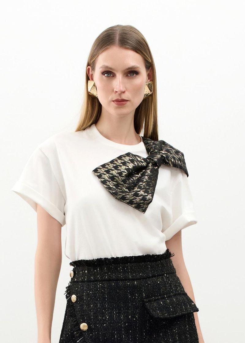 Um clássico reinventado com elegância e delicadeza. Esta blusa em malha de algodão ultra macia oferece um caimento impecável, garantindo conforto sem perder a sofisticação. O destaque fica por conta do maxi laço bordado em jacquard, que adiciona textura e um toque de romantismo à peça. A modelagem versátil permite combinações tanto casuais quanto sofisticadas. No tom off-white, a peça traz leveza e frescor, perfeita para um look elegante e atemporal. Combine com uma saia plissada e sandálias de salto bloco para uma composição delicada e refinada, ideal para eventos diurnos.