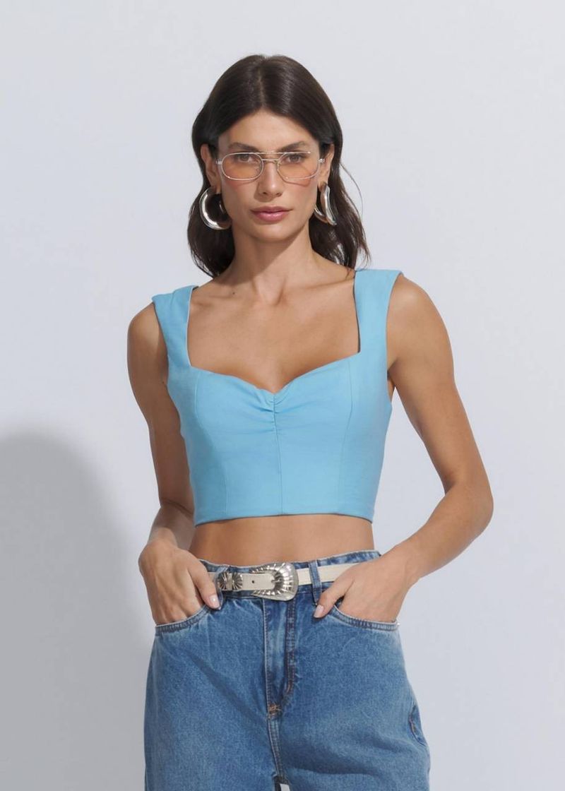 Com um tom suave e refrescante, o top azul claro traz leveza para os looks de verão. O franzido no busto proporciona feminilidade, enquanto o zíper metálico nas costas adiciona um toque moderno. Combine com jeans de cintura alta ou alfaiataria branca para um styling leve e sofisticado.