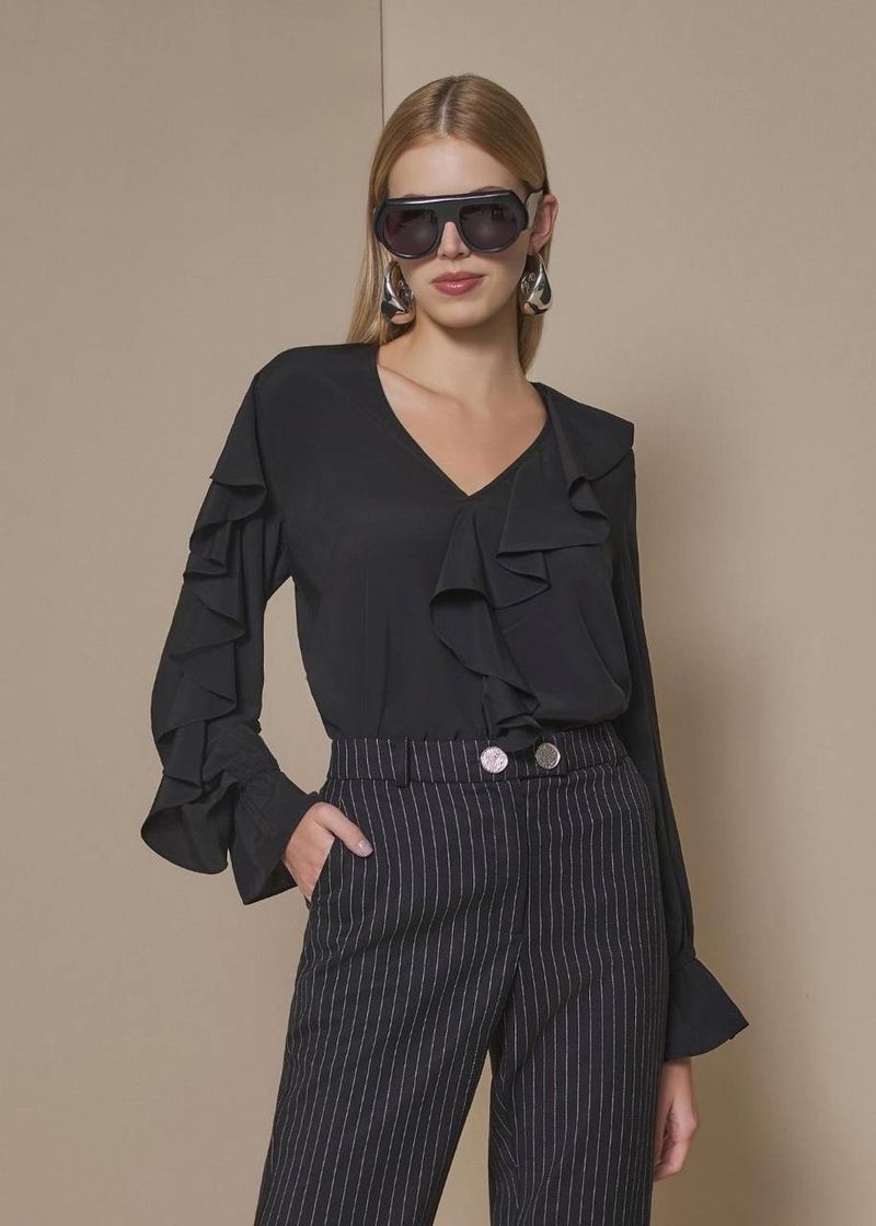 Clássica com um toque fashion, a blusa se destaca pelos babados posicionados de forma assimétrica, que trazem fluidez e sofisticação ao visual. As mangas longas com punhos ajustados criam uma silhueta impecável, enquanto o preto reforça o caráter eterno e versátil da peça. Combine com alfaiataria risca de giz, couro ou jeans para transitar entre produções elegantes e casuais com total facilidade. Uma escolha essencial para quem busca estilo refinado e atual.