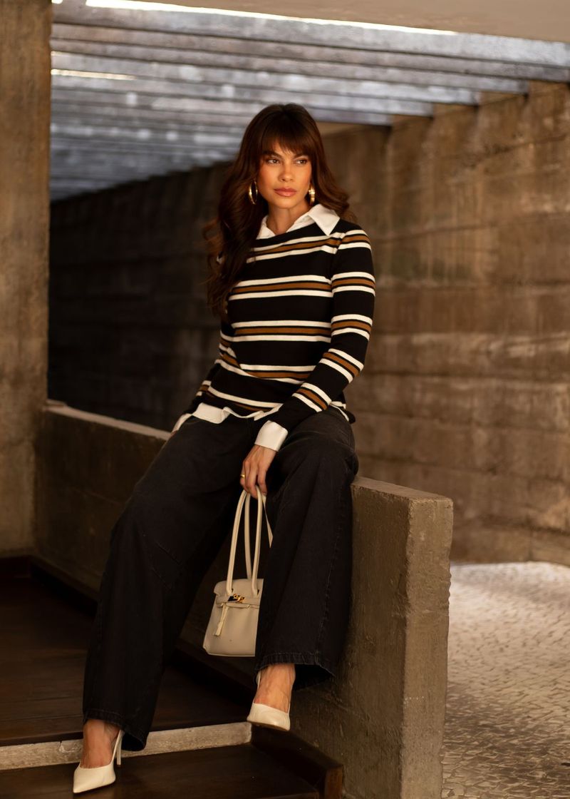 Blusa Feminina De Manga Longa Listrada Em Tricot - Preto