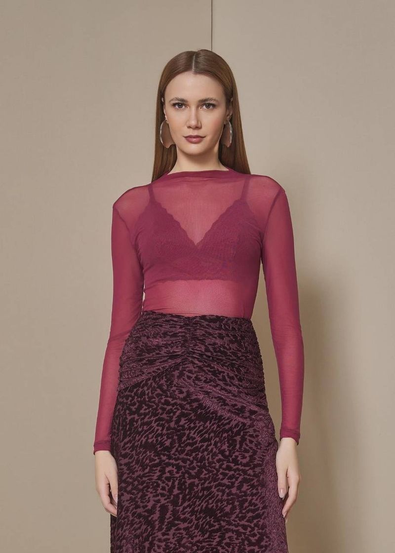 Em tom intenso e elegante, a blusa de tule bordo é pura sofisticação. Sua transparência delicada cria um contraste moderno com a pele, enquanto as mangas longas trazem equilíbrio ao visual. Ideal para composições noturnas com calças de alfaiataria ou saias estruturadas, é uma peça que une sensualidade e refinamento na medida certa.