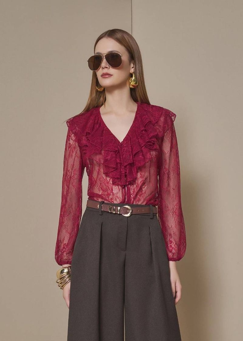 O bordô ganha protagonismo nesta blusa de renda, evocando o romance intenso e a profundidade emocional das cenas iluminadas pelos holofotes do circo europeu. É uma cor que abraça o corpo com elegância dramática, revelando feminilidade com densidade e poesia. Os babados delicados acompanham o movimento do corpo como uma coreografia precisa, enquanto a transparência refinada e os botões forrados elevam a peça a um nível de requinte atemporal. Versátil, ela transita do jantar especial ao evento sofisticado, sempre com um toque de mistério e presença marcante. Para a mulher que transforma disciplina em arte, e cada aparição em um espetáculo memorável.