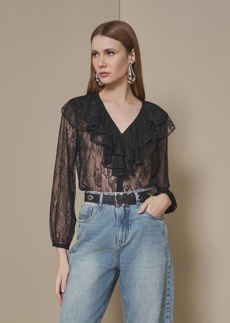 Há peças que parecem sussurrar mistério e esta blusa em renda preta traz exatamente essa atmosfera. Inspirada na força silenciosa das acrobatas antes do espetáculo, ela revela delicadeza e poder em igual medida. Os babados no decote criam movimento hipnotizante, enquanto os botões forrados e o punho com elástico reforçam a sofisticação artesanal que define a coleção. A transparência sutil dialoga com a ideia de controle e liberdade, criando um sensual elegante que nunca entrega demais. Perfeito para quem domina seu palco com presença e naturalidade. Use com alfaiataria para um contraste impactante ou com jeans para um visual contemporâneo e autoral. Para quem vive nos bastidores com intensidade e entra em cena com brilho absoluto.