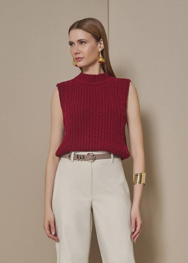 A blusa em tricot texturizado na cor bordô traduz sofisticação com personalidade. O tricot encorpado possui toque macio e trama em relevo que adiciona profundidade visual à peça. A modelagem reta levemente encurtada valoriza a cintura, enquanto o shape sem mangas alonga a silhueta e deixa o visual moderno. As pregas sutis nas costas criam um efeito estruturado elegante, elevando o acabamento com inspiração na alfaiataria contemporânea. Versátil e confortável, é uma escolha refinada para composições urbanas, profissionais ou produções mais elaboradas.