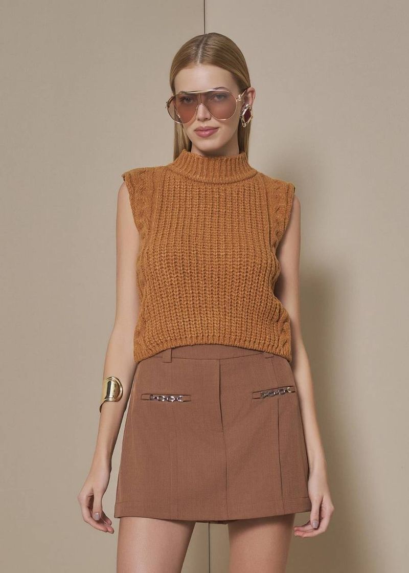 Com uma proposta elegante e acolhedora, a blusa em tricot texturizado na cor madeira aposta em sofisticação natural. O tricot de toque macio e textura marcante cria um visual rico em detalhes, ideal para composições contemporâneas. A modelagem reta levemente encurtada valoriza a cintura alta, enquanto o shape sem mangas traz equilíbrio e leveza ao look. As pregas delicadas nas costas proporcionam estrutura e movimento sutil, elevando o design com um acabamento premium. Uma peça confortável, prática e cheia de estilo para o dia a dia urbano.
