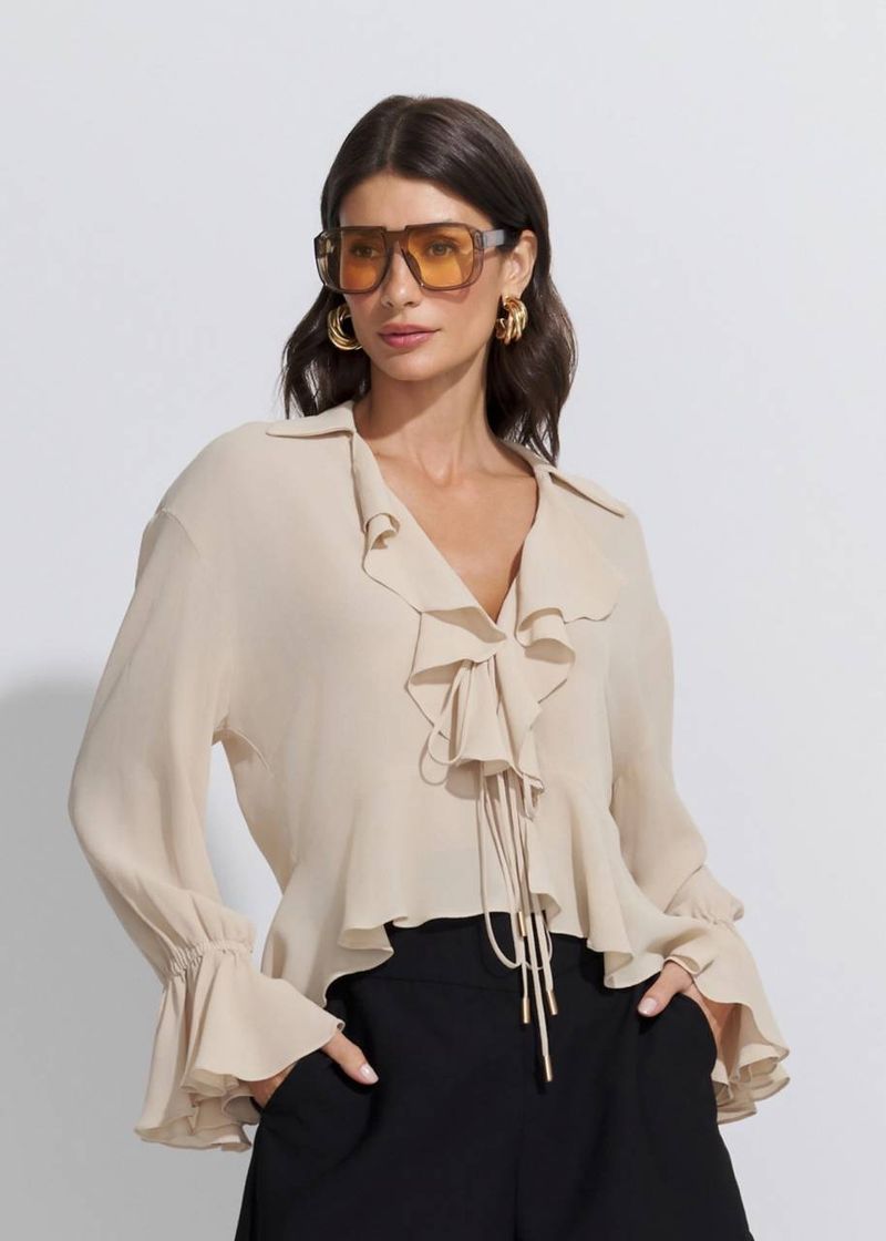 Com um tom que exala delicadeza e refinamento, a cor aveia valoriza ainda mais a fluidez dos babados dessa blusa. A amarração ajustável permite diferentes composições, seja mais justa ou soltinha. Uma peça atemporal que conversa com as tendências atuais e traz um toque de romantismo moderno ao visual.