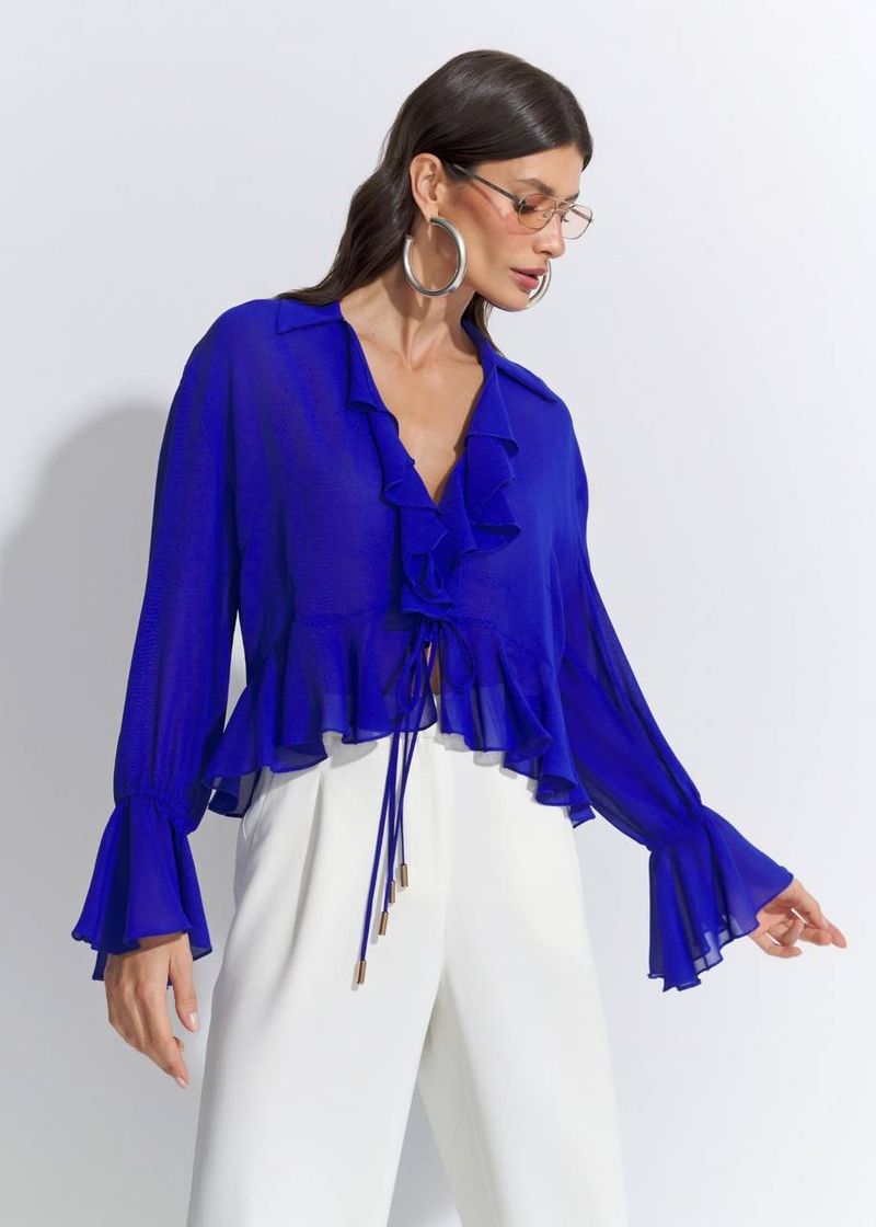 Na cor real blue, essa blusa é um verdadeiro statement de estilo. Os babados garantem fluidez e leveza, enquanto o tom vibrante injeta personalidade ao look. A amarração frontal permite composições criativas, tornando-a ideal para quem ama peças versáteis, femininas e que chamam atenção com elegância.