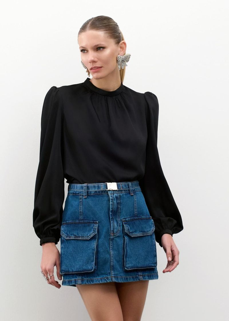Com um design clássico e detalhes refinados, essa blusa de crepe texturizado se destaca pela estrutura impecável das mangas bufantes, que adicionam um volume elegante e sofisticado. A gola delicada com botão forrado complementa o caimento fluido da peça. No preto, o visual se torna imponente e versátil, ideal para eventos noturnos ou produções mais sofisticadas. Combine com saia lápis de couro e sandálias de salto fino para um look impactante e atemporal.