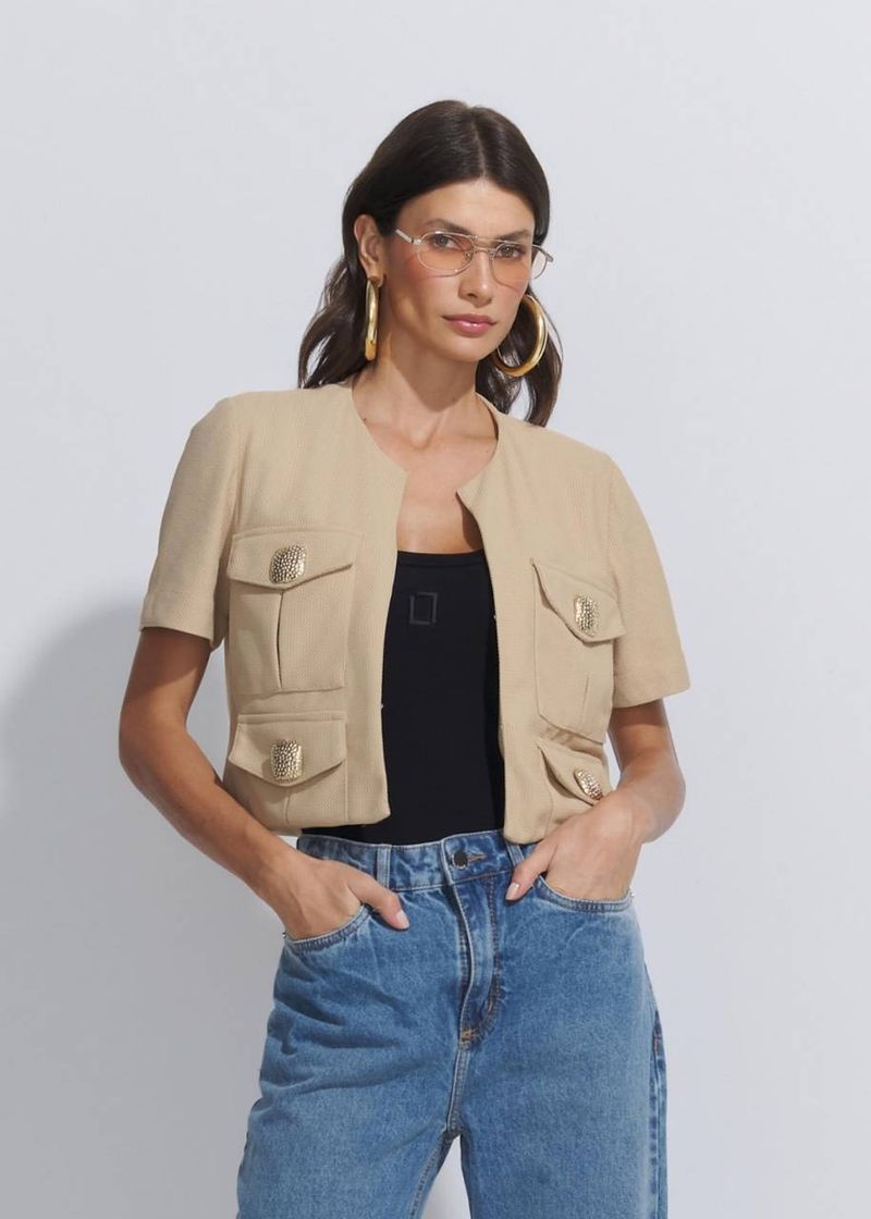 A blusa cropped na cor areia é a tradução do minimalismo sofisticado. O tom neutro e atemporal se harmoniza com qualquer paleta, facilitando combinações elegantes do dia à noite. Os botões dourados se destacam com sutileza, criando um visual refinado e contemporâneo que é ideal para quem busca uma peça versátil, mas cheia de presença.