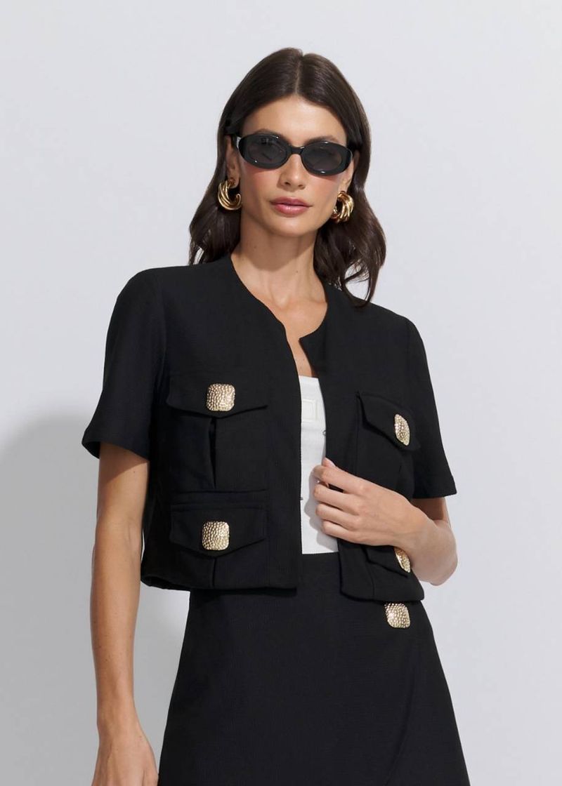 A versão preta da blusa cropped exala poder e elegância. Os botões e colchetes metálicos criam um contraste marcante, enquanto a modelagem estruturada valoriza a silhueta com atitude. Uma peça curinga que transita com facilidade entre produções noturnas e visuais urbanos cheios de estilo.