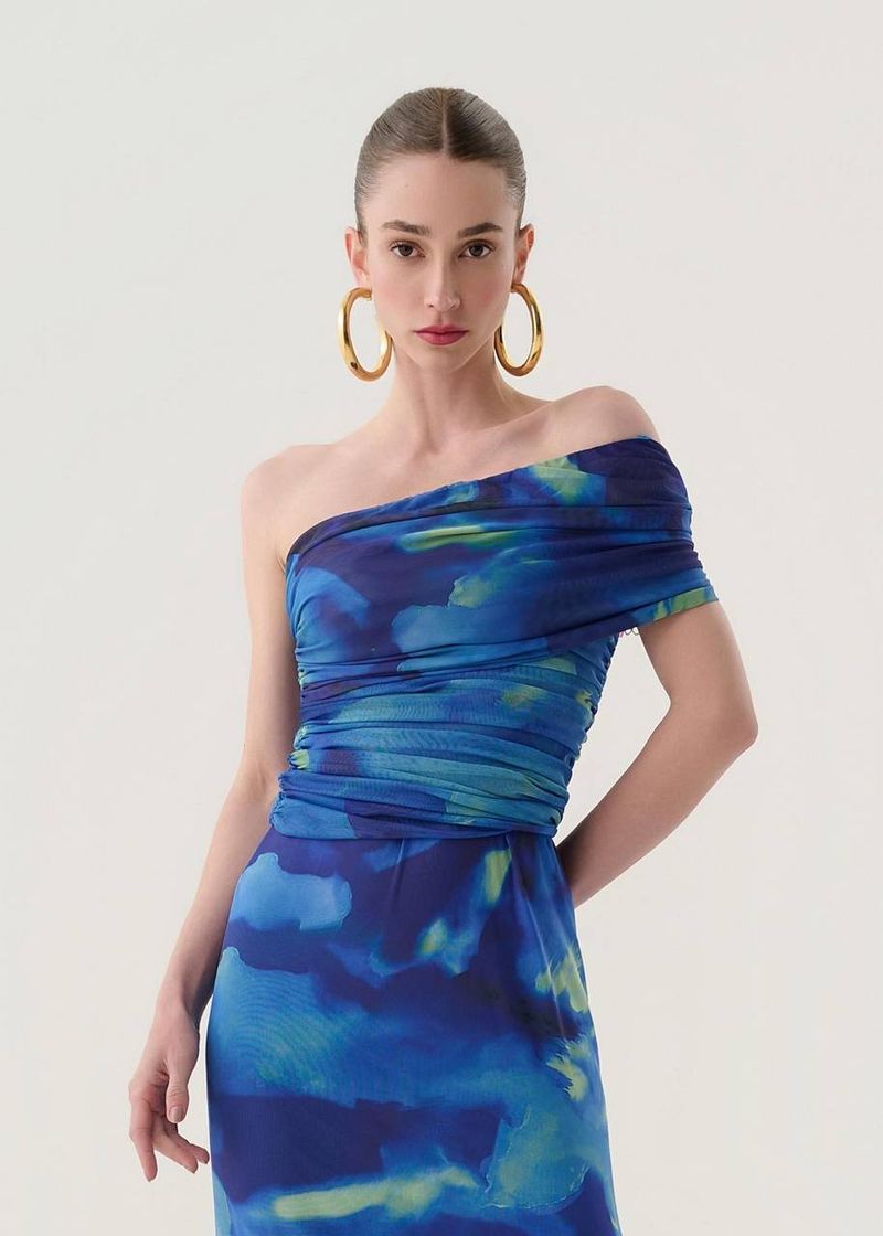 A blusa um ombro só na estampa blue match traz uma proposta ousada e sofisticada, unindo o frescor do tom azul com o romantismo dos toques rosados. Os franzidos laterais e no ombro valorizam a silhueta com elegância e criam movimento único. Ideal para compor produções noturnas com saias fluidas ou para um look mais urbano com calça de alfaiataria. Aposte em acessórios delicados para destacar ainda mais o decote assimétrico.