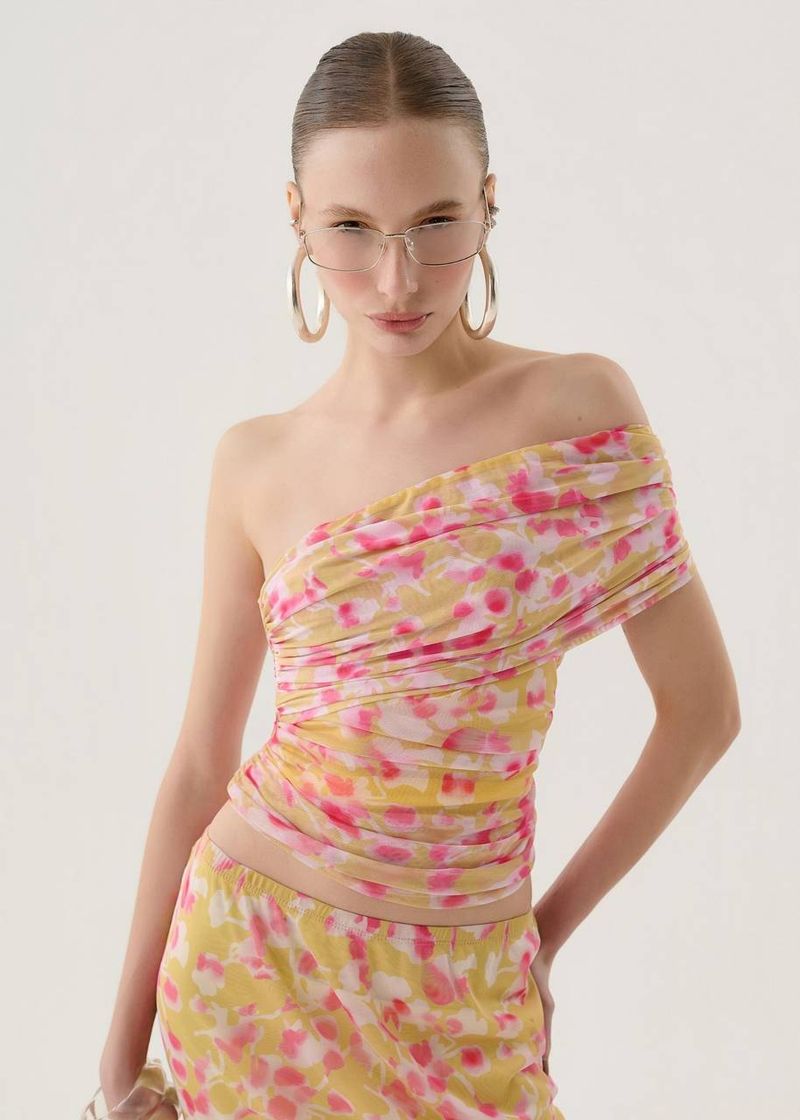 Na cor manteiga, a blusa um ombro só ganha um ar fresh e moderno, perfeita para iluminar produções de verão. O jogo de franzidos proporciona caimento impecável, valorizando o busto e criando um efeito visual interessante. Use com shorts em linho para um look casual chic ou com saias longas estampadas para momentos especiais. Os acessórios dourados são o complemento ideal para esse tom suave e elegante.