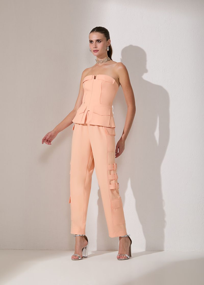 Calça em tom Candy Orange, confeccionada em crepe leve e fluido, apresenta um design moderno e funcional. Destaque para o confortável elástico no cós e os recortes ao longo das pernas, que proporcionam uma silhueta elegante. Além disso, possui bolsos laterais com tampas funcionais, trazendo praticidade ao look. Os detalhes de faixas com passantes na altura dos joelhos adicionam um toque de estilo contemporâneo à peça. Ideal para quem busca um visual sofisticado sem abrir mão do conforto. Arrase com essa calça Carrot Crepe Utilitário!