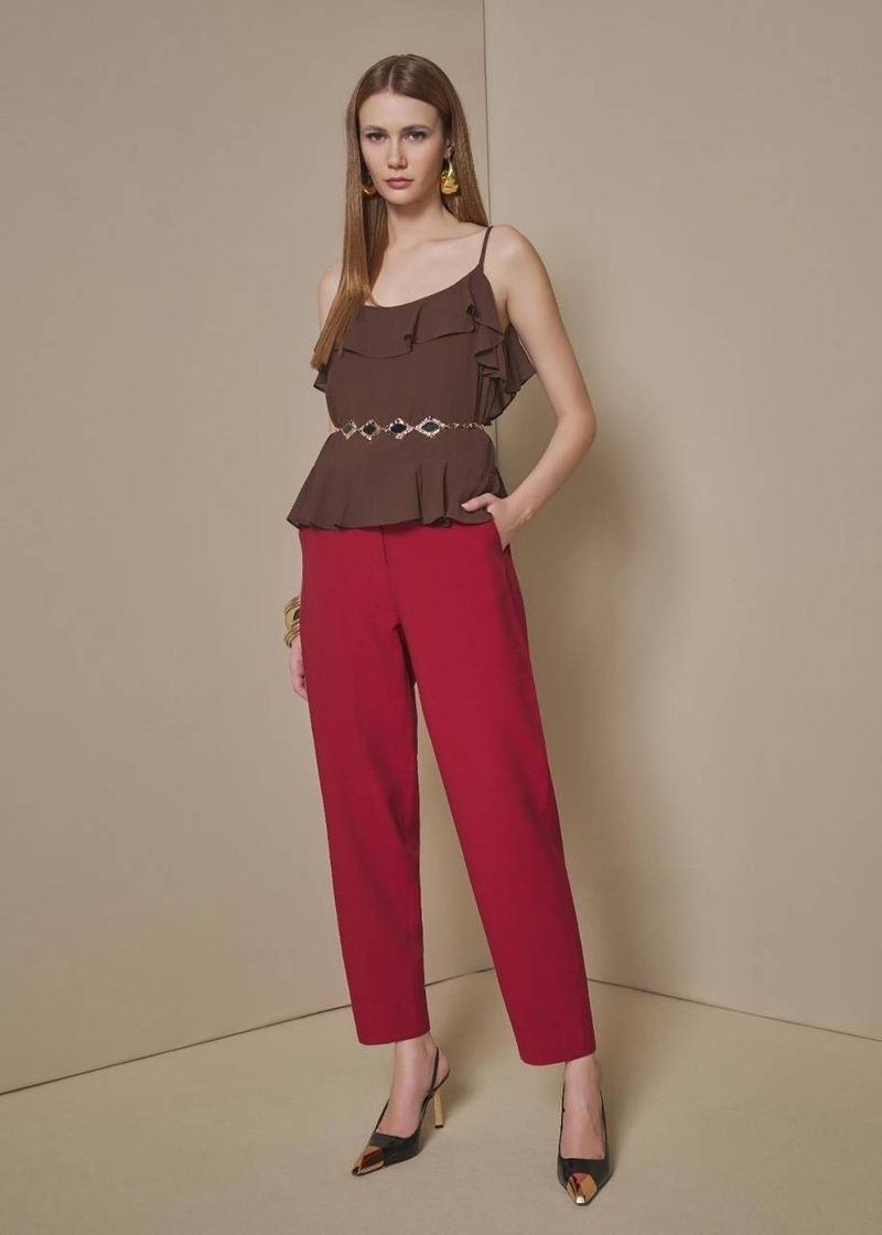 A calça cenoura bordô é a expressão perfeita de elegância com personalidade. Seu tom intenso adiciona sofisticação às produções, enquanto a modelagem de alfaiataria garante estrutura e caimento impecável. Ideal para quem busca um visual moderno e marcante, que transita entre o clássico e o contemporâneo.