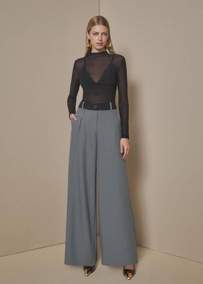 Calça Feminina Wide Leg Cós Duplo Em Alfaiataria - Cinza