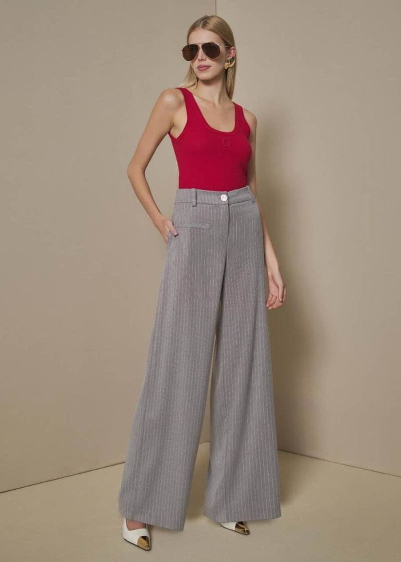 A calça wide leg listrada em tom cinza é a escolha ideal para um visual sofisticado e contemporâneo. O caimento fluido alonga a silhueta, enquanto as listras verticais reforçam o toque elegante e moderno. O fechamento frontal com botão metálico e os detalhes sutis de alfaiataria trazem um ar refinado, perfeito para produções de trabalho ou encontros casuais com estilo.