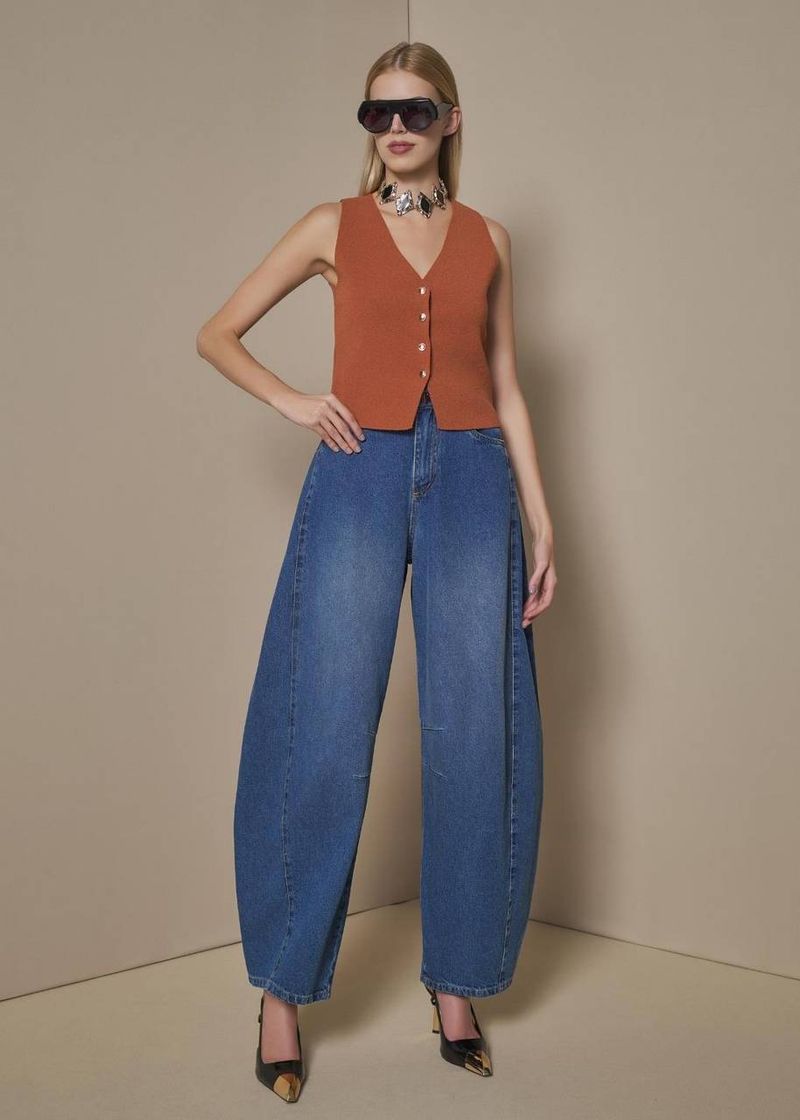 Em denim tradicional, a calça cargo ganha leveza e modernidade. A modelagem ampla cria movimento, enquanto os bolsos utilitários reforçam o mood contemporâneo. A cintura alta valoriza o corpo e permite composições que vão do casual ao fashion sem esforço. Um jeans versátil, cheio de personalidade e ideal para elevar o estilo do dia a dia.