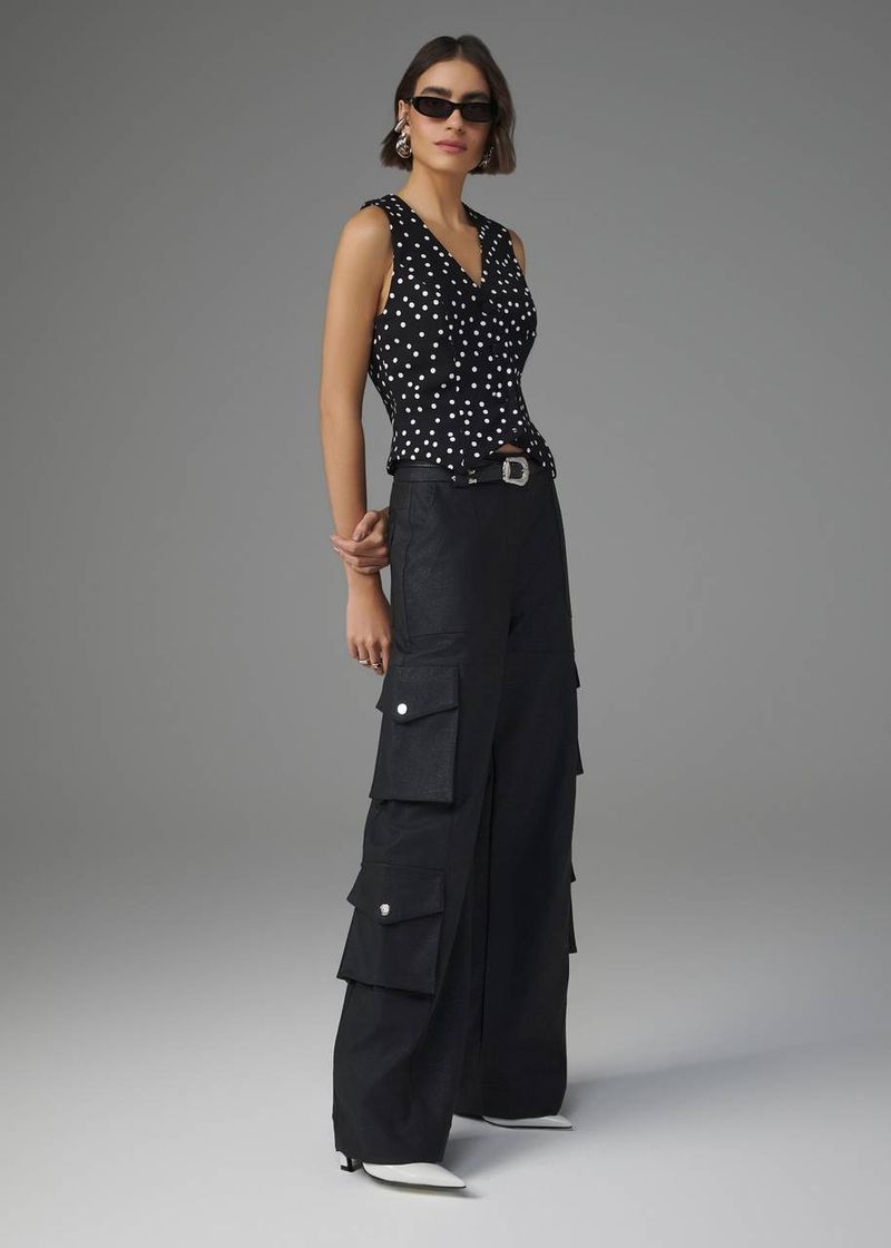 Combinando sofisticação e atitude, esta calça wide leg se destaca pelo couro sintético estonado de textura marcante e caimento estruturado. Os bolsos cargo laterais adicionam um toque moderno e funcional, enquanto a pala traseira e os bolsos reforçam o ajuste impecável. O fechamento frontal com zíper e botões de pressão personalizados finaliza a peça com um acabamento refinado. Na cor preta, a calça se torna ainda mais imponente e versátil, ideal para produções sofisticadas e impactantes.
