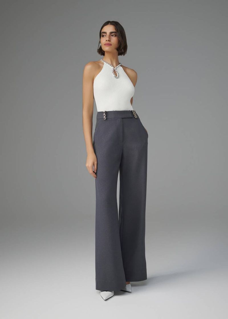 Estruturada e elegante, esta calça de alfaiataria sarjada combina um caimento impecável com detalhes sofisticados. O cós trespassado adiciona um toque refinado, enquanto os passantes com metal personalizado reforçam a exclusividade da peça. As pences traseiras garantem ajuste perfeito, e o fechamento por zíper e colchetes mantém a sofisticação do modelo. Na tonalidade chumbo, a peça se destaca pelo visual moderno e sofisticado, perfeito para composições contemporâneas.