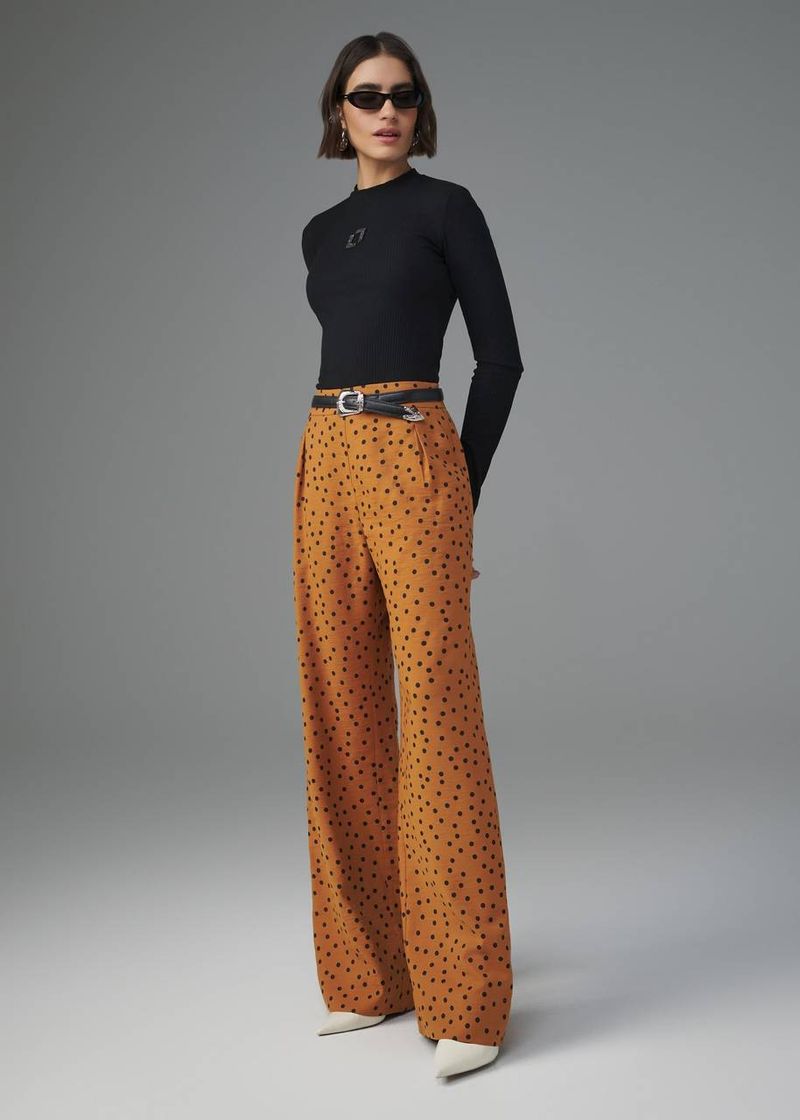 Calça Wide Leg Alfaiataria Estampa Poá - Camel