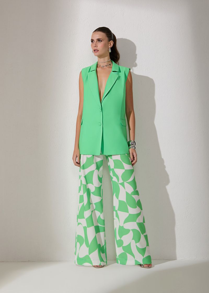 Calça wide leg em crepe, com um suave toque de linho e estampa paradiso em tom Summer Green. Seu cós e passantes conferem elegância, enquanto o fechamento em zíper e botão proporciona praticidade. A presença das pences traseiras assegura um caimento perfeito, resultando em uma silhueta extremamente elegante e confortável. Ideal para quem preza por conforto e sofisticação em todos os detalhes do seu estilo.