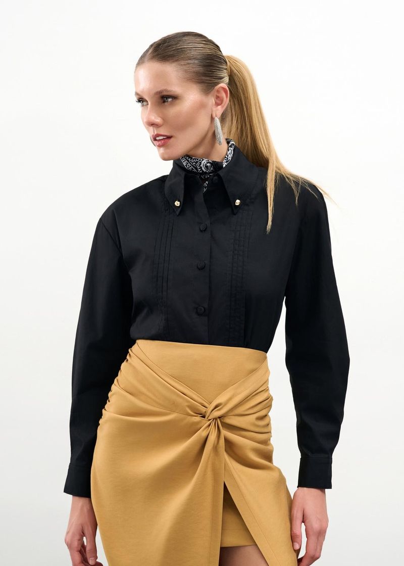 O preto transforma esta camisa cropped em uma peça indispensável para quem busca sofisticação com uma pitada de ousadia. As nervuras frontais conferem textura e elegância, enquanto os botões forrados no patê e nos punhos garantem um design polido. Os botões de metal na gola completam o visual com atitude. Combine com uma calça de couro e ankle boots para um look noturno cheio de personalidade.