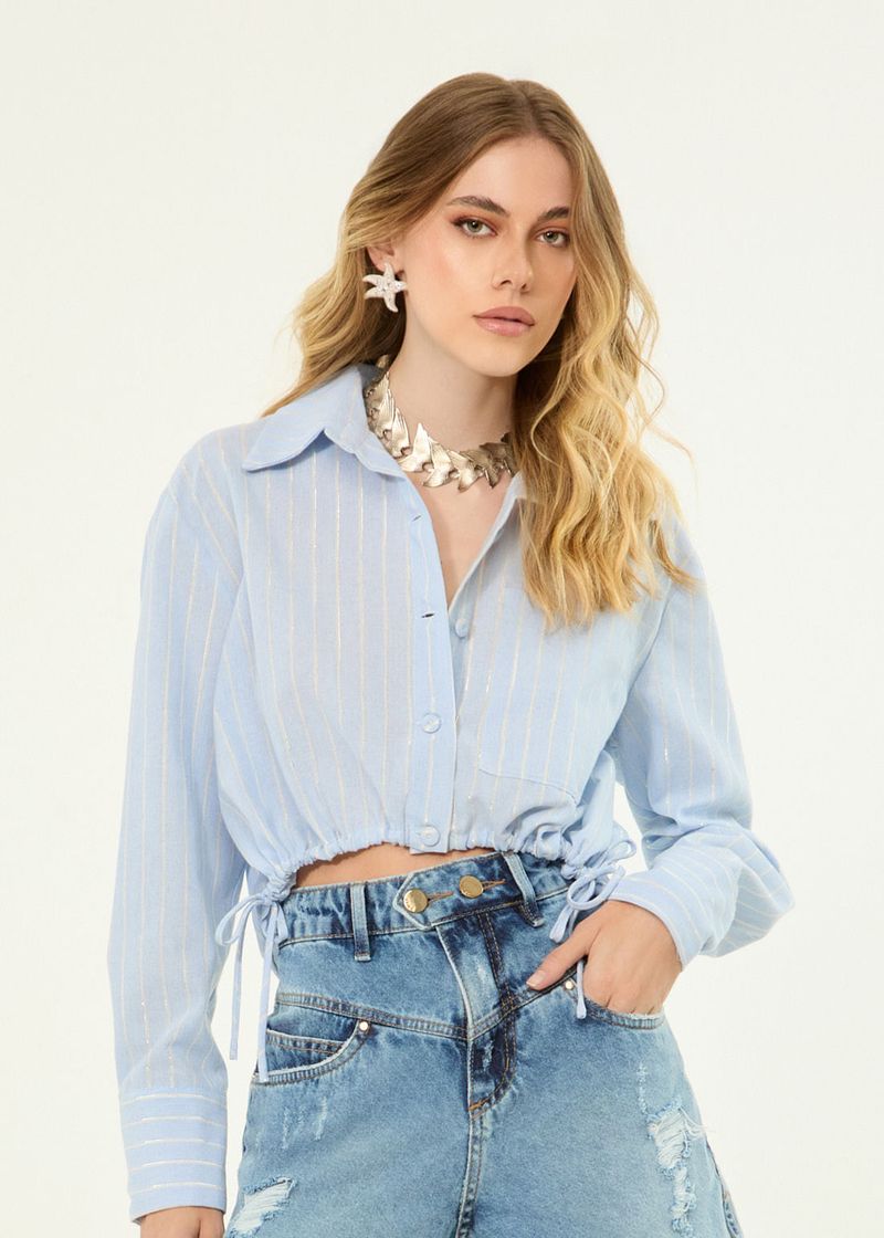 Camisa Cropped Manga Longa Listras - Denim