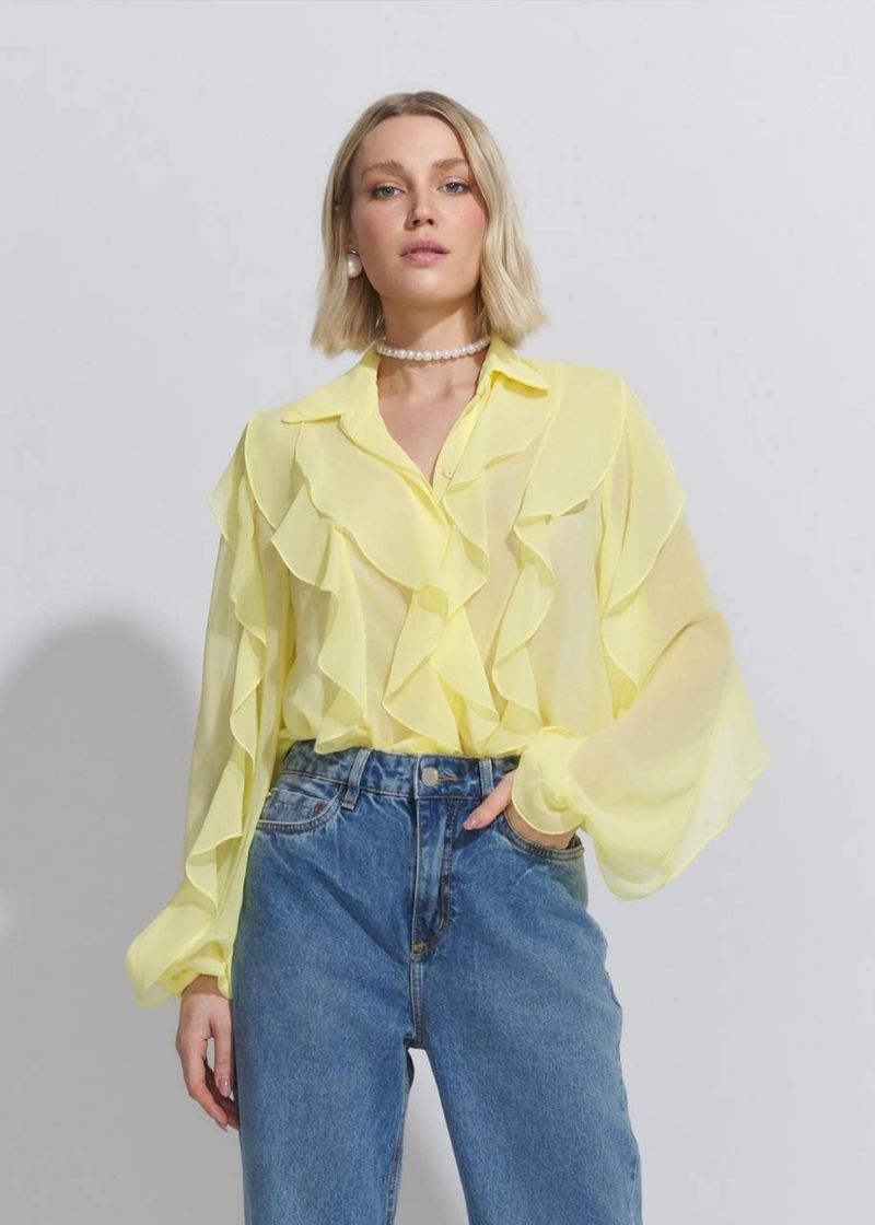 O tom manteiga ilumina o visual com suavidade e elegância atemporal. Os babados em jabot adicionam feminilidade, enquanto o fechamento refinado e o punho delicado completam a construção de alfaiataria. Use com jeans retos ou shorts de cintura alta para ocasiões casuais com charme, ou com calças flare para um mood sofisticado. Complemente com sandálias nude e acessórios em dourado fosco.