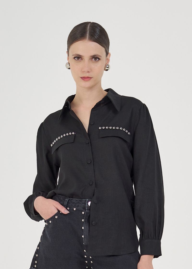 Camisa Manga Longa em linho sarjado. Esta peça refinada, apresenta detalhes cuidadosamente projetados, incluindo tampas decorativas no busto e uma prega traseira que acrescenta um toque de sofisticação. O patte e os punhos com botões forrados garantem um acabamento impecável. Além disso, os detalhes metalizados nas tampas adicionam um toque moderno e luxuoso à camisa. Elevar o seu visual com um toque de classe!