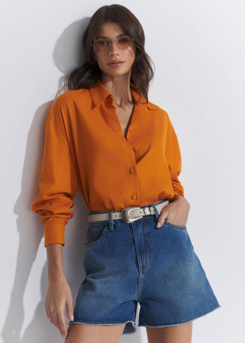 O tom ocre confere um toque terroso e moderno à clássica camisa de manga longa. Detalhes como os botões forrados e a pence posterior traduzem sofisticação e caimento impecável. Combine com peças em off-white ou tons de verde para um visual atual e elegante. Ideal para ambientes de trabalho e encontros casuais. Use com salto bloco ou tênis clean para uma proposta mais urbana.