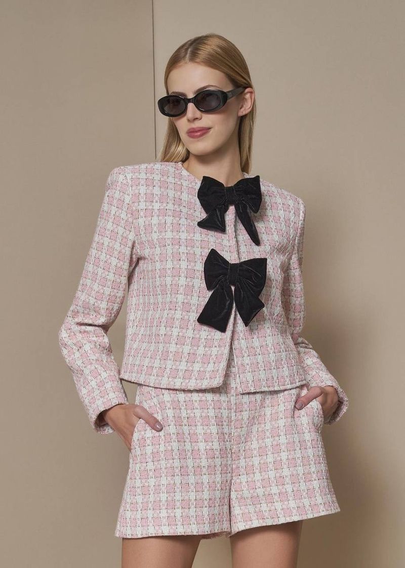 O casaco curto em tweed Rosa é pura delicadeza com presença. A textura rica do tweed ganha ainda mais charme com os laços de veludo na abertura frontal, criando um contraste sofisticado entre estrutura e suavidade. Os colchetes internos garantem acabamento limpo e elegante, mantendo o foco nos detalhes que fazem a peça brilhar. Perfeito para iluminar produções de inverno com feminilidade, estilo e um toque de romance moderno.