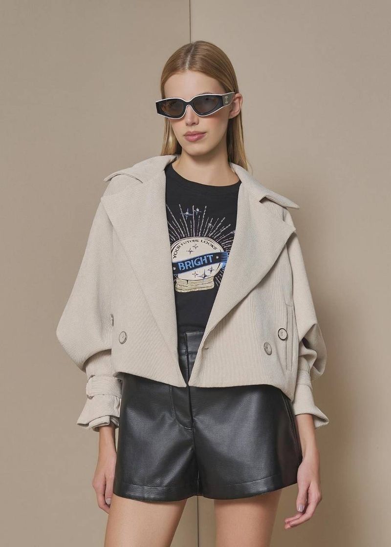 Em Vanilla, o casaco de veludo cotelê ganha uma leitura leve e sofisticada, perfeita para iluminar produções invernais. O contraste entre o tom claro e o veludo texturizado cria um charme especial, enquanto os botões forrados com acabamento metálico elevam o visual com delicadeza. A manga martingale com fivela meia argola dupla acrescenta modernidade e estrutura, resultando em uma peça que combina elegância e suavidade com maestria.