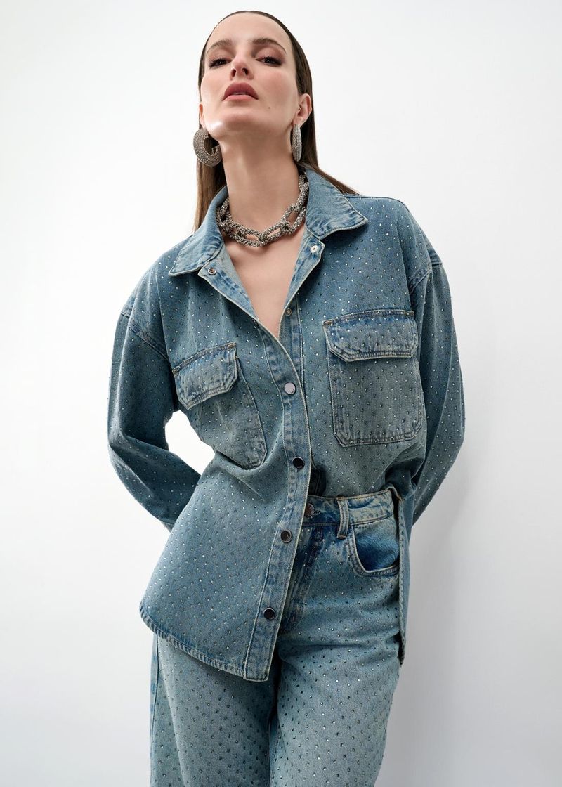 A união perfeita entre o clássico e o glamouroso define esse casaco alongado estilo camisa. Confeccionado em jeans 100% algodão, a peça oferece estrutura e conforto, enquanto os dois bolsos frontais garantem funcionalidade e um toque utilitário. O grande destaque fica por conta da aplicação de hot fix strass sextavado, que adiciona um brilho sofisticado e transforma a peça em um verdadeiro statement fashion. No jeans claro, o efeito reluzente do strass se destaca ainda mais, criando um visual moderno e impactante. Combine com peças neutras para equilibrar o brilho ou aposte no total denim para uma produção ousada e estilosa.
