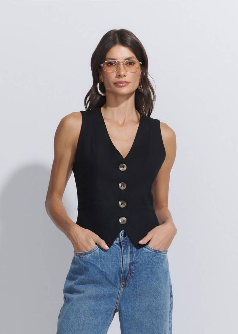 Clássico e poderoso, o colete na cor preta é sinônimo de elegância com personalidade. O corte impecável e o tecido leve contrastam com a força da cor, criando uma peça versátil que transita entre o urbano e o sofisticado. Use fechado como top ou aberto como terceira peça. O resultado será sempre um visual impactante e alinhado.