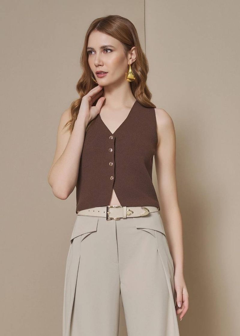 O colete em tricot canelado na cor Choco é a escolha ideal para quem busca aconchego com elegância. O decote redondo valoriza a região do colo e deixa o visual mais delicado, enquanto o canelado alonga a silhueta sem esforço. Versátil, funciona tanto como peça principal quanto como sobreposição em dias mais frescos.