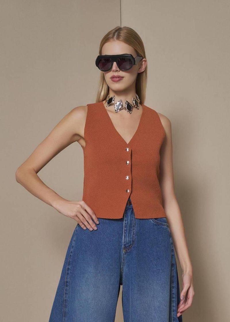 Na cor Madeira, o colete em tricot canelado ganha um toque rústico sofisticado. A textura marcada destaca a qualidade do fio e cria profundidade no look, deixando a peça perfeita para composições modernas e atemporais. Use com camisas, saias fluidas ou jeans para um visual equilibrado e estiloso.