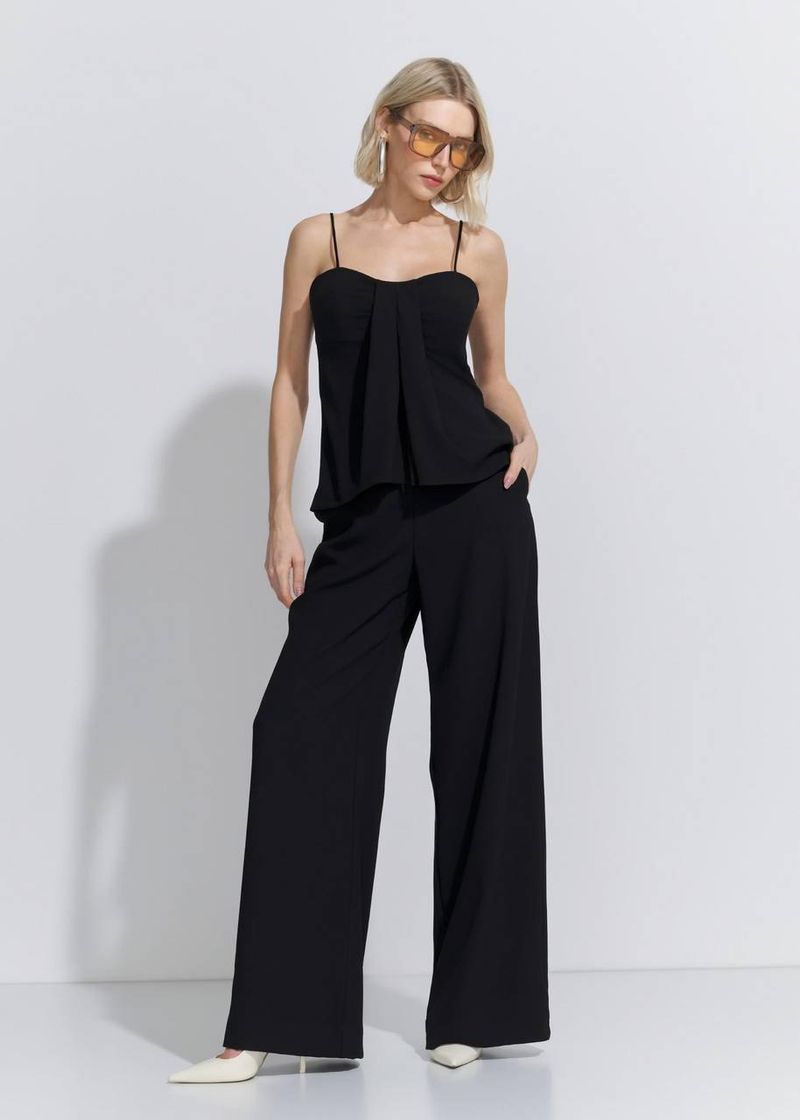 O conjunto preto traduz elegância contemporânea com atitude. A blusa de alcinha com detalhe frontal e zíper nas costas imprime sofisticação com leveza, enquanto a calça reta de alfaiataria garante presença e imponência. Perfeito para eventos noturnos, coquetéis ou jantares com dress code refinado. Combine com salto alto, brincos marcantes e uma clutch de veludo ou cetim com alça de metal para um toque glam na medida certa.