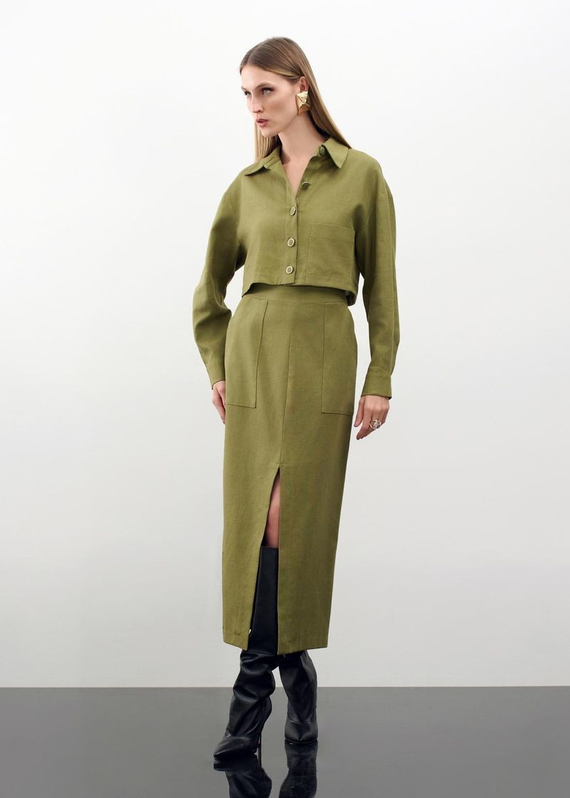 Conjunto Camisa Cropped E Saia Mídi Linen - Oliva