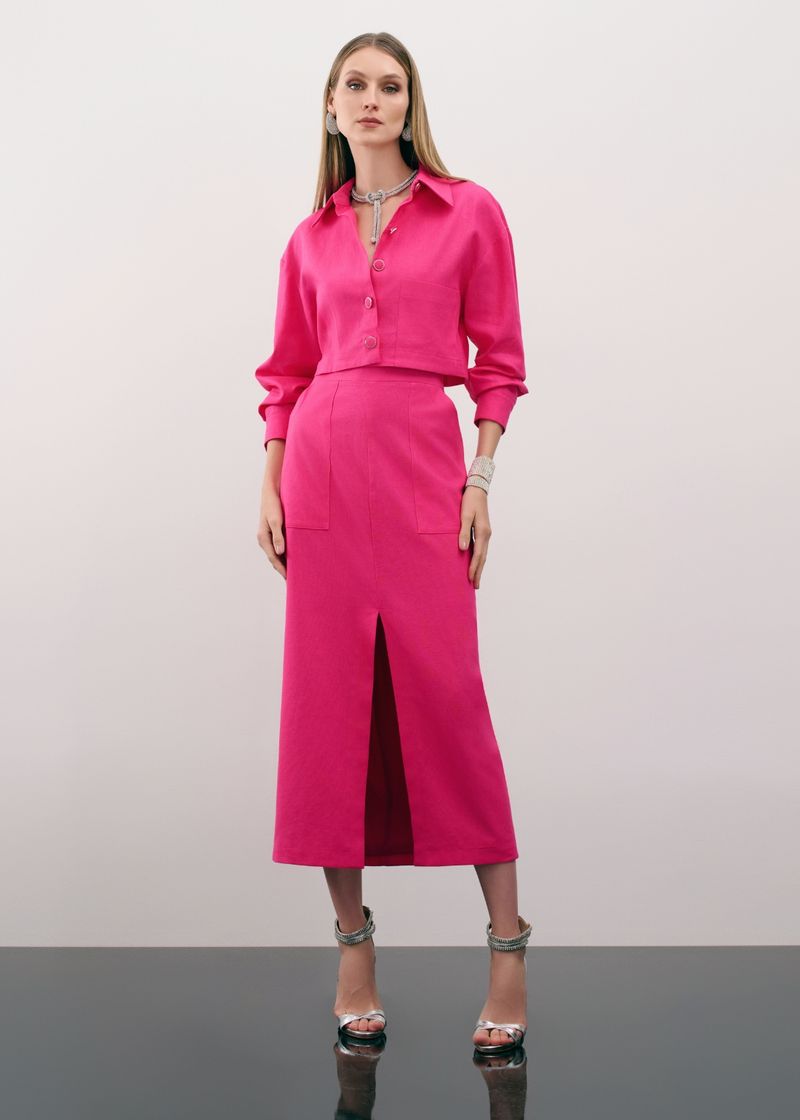Conjunto Camisa Cropped E Saia Mídi Linen - Pink