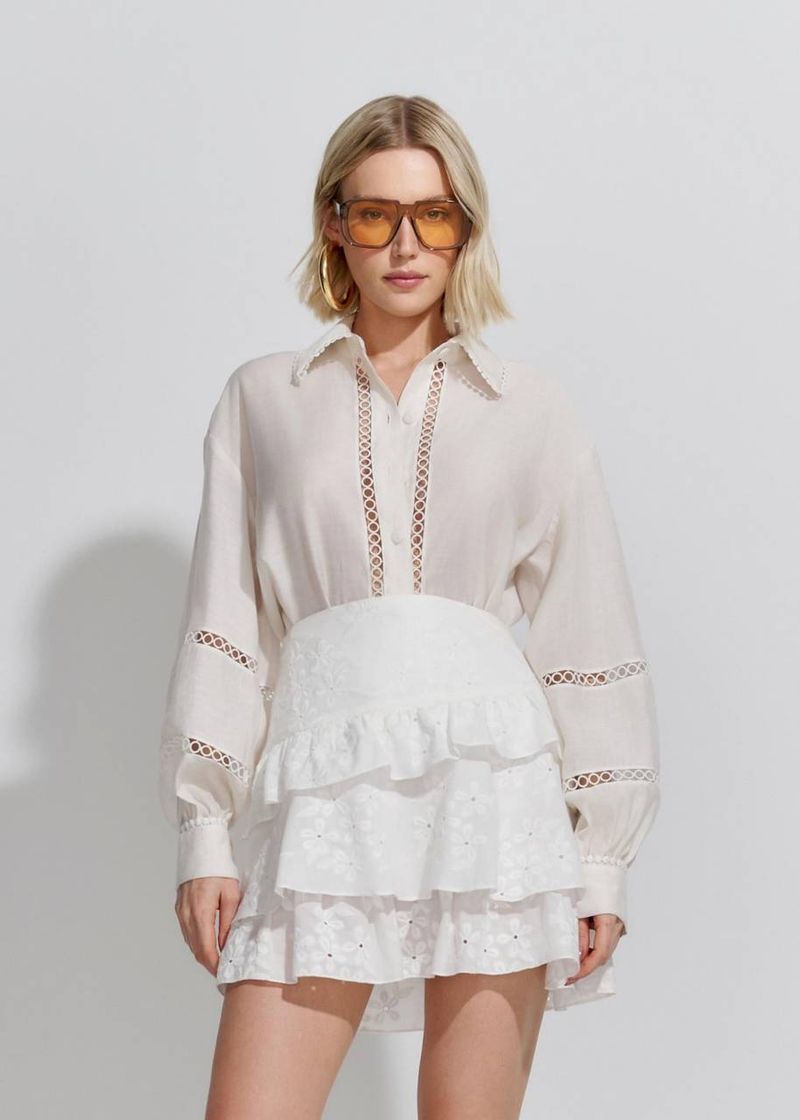 Conjunto Camisa Voil Saia Babados Bordado Garden - Off White