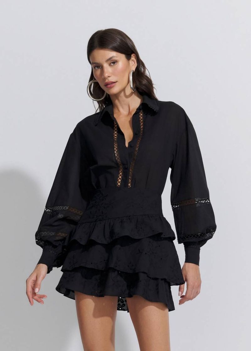 Conjunto Camisa Voil Saia Babados Bordado Garden - Preto